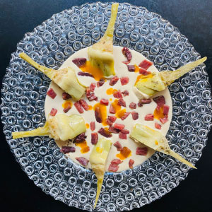 Brotes de bambú con mujarama y salazones a la llama (marrajo y capellán)